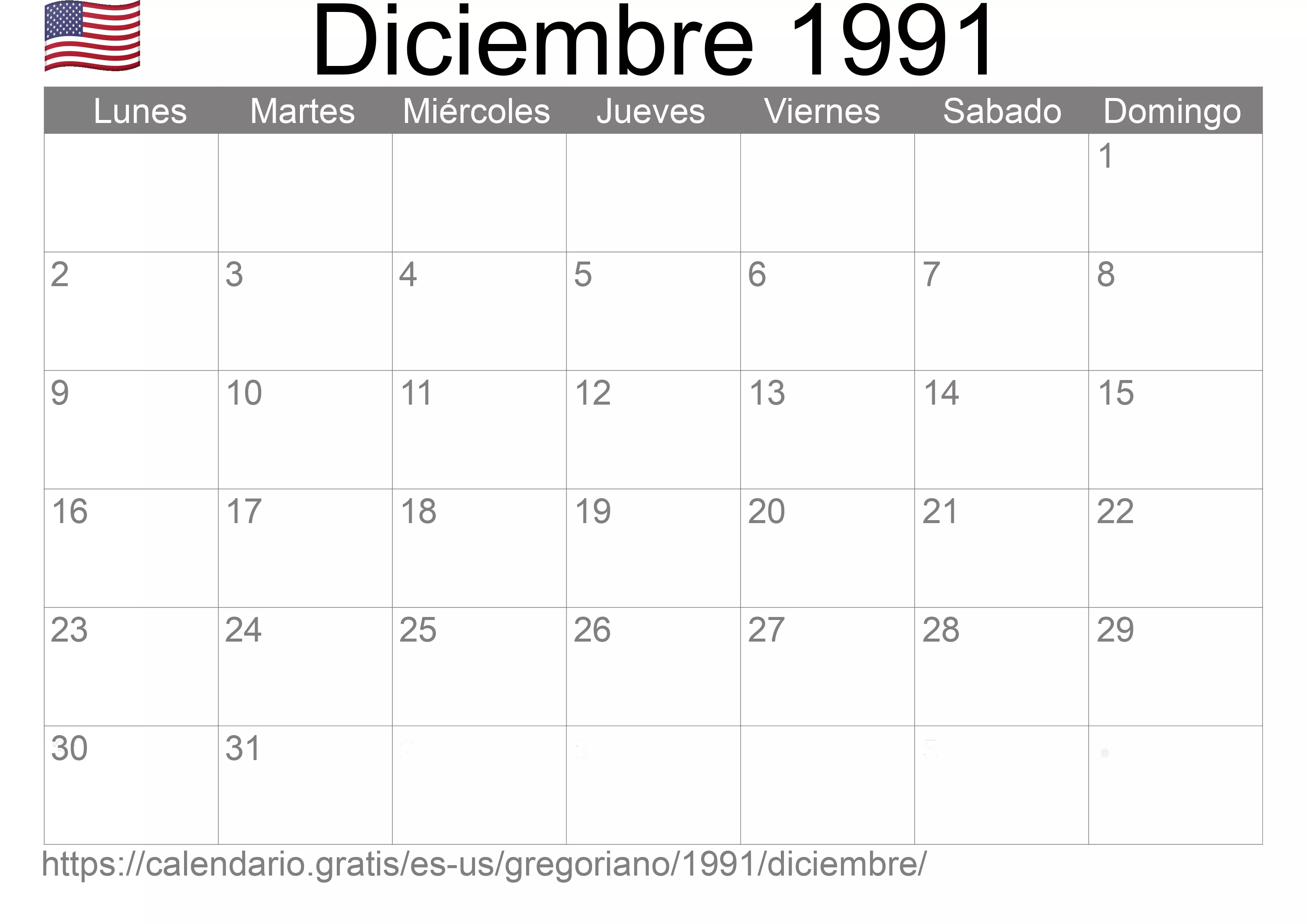 Calendario Diciembre 1991 de Estados Unidos de América en español ☑️